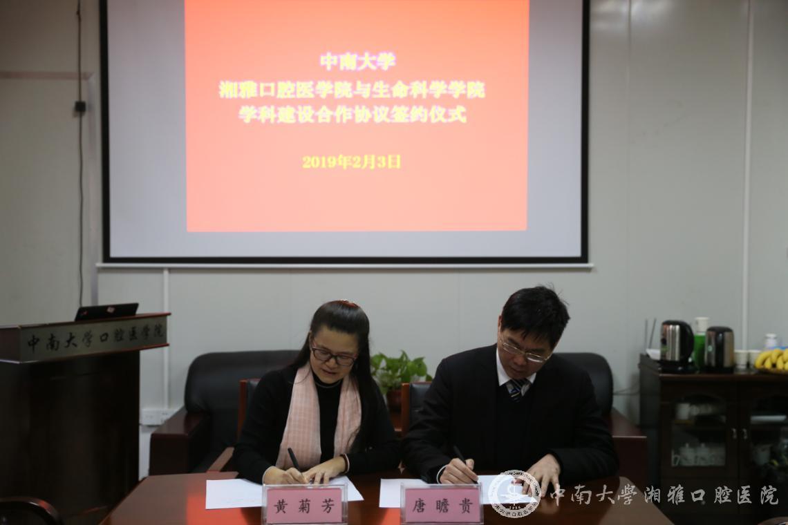 湘雅口腔医学院党委书记邓超纲、院长唐瞻贵,生命科学学院党委书记刘静、院长黄菊芳代表双方签署了合作协议。