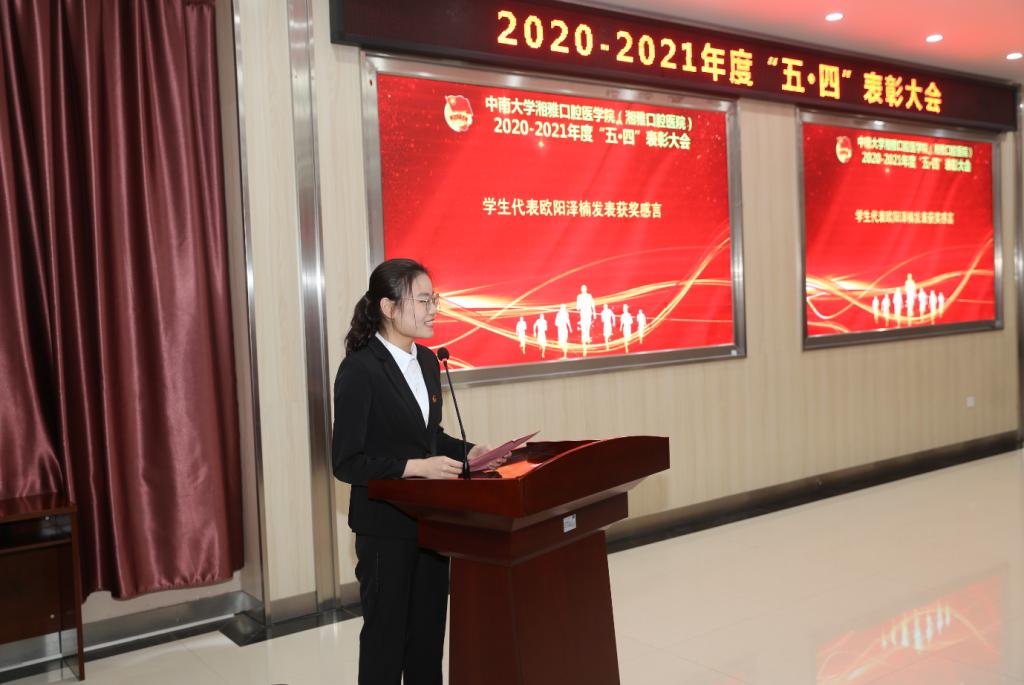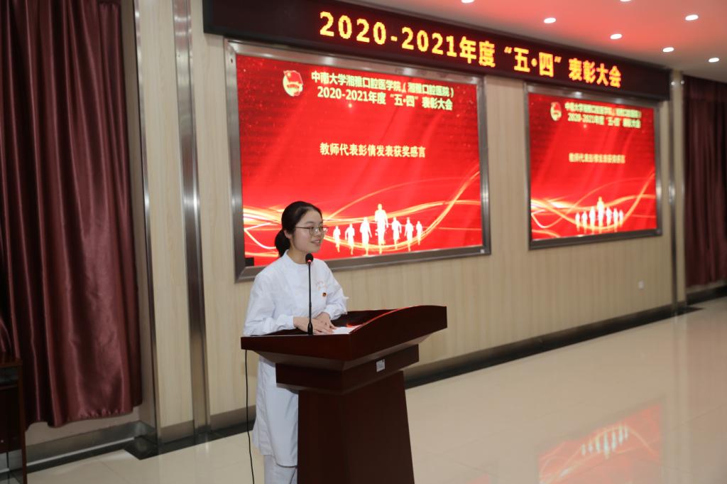 获奖学生代表,院学生会主席欧阳泽楠在发言时说,表彰不仅是一种肯定,也意味着更多期许,新时代青年要把个人的命运同祖国的命运紧密联系在一起,把个人的追求融入全民族的共同理想之中,自觉服务祖国和人民,创造出无悔的青春、永恒的青春。获奖教师代表彭倩在发言时说,要传承发扬伟大的“五四”精神,勇担时代责任、矢志奋斗拼搏、努力建功立业,在医院改革发展的新征程中书写绚丽青春,以优异的成绩迎接党的百年华诞。