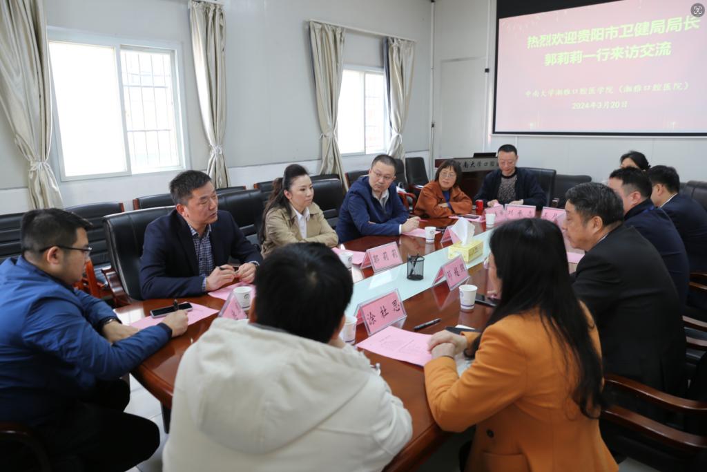 出席会议的还有贵阳市卫健局副局长朱恺、综合处副处长杨德龙、交流合作处处长余美娣,贵阳市口腔医院办公室主任刘承志,我院综合办主任胡小平、医务部主任罗姜。