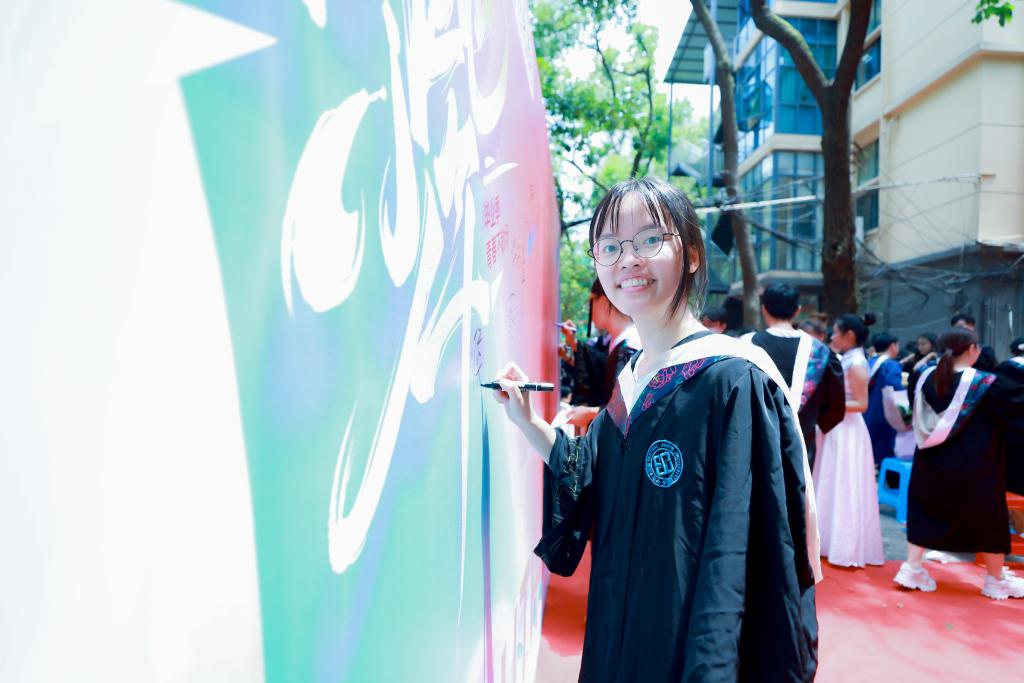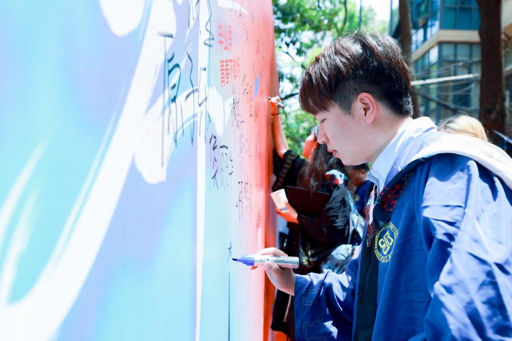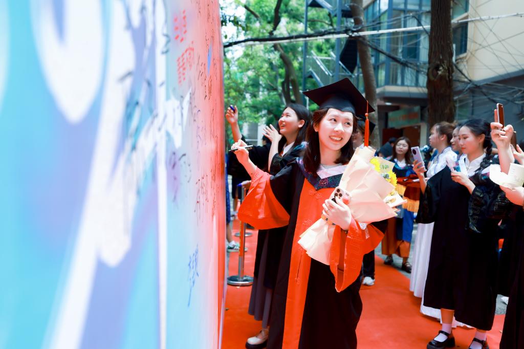 毕业生们沿着红毯来到典礼现场,学院精心为毕业生们准备了签名墙和冷餐,同学们在银杏树下拍照留念、互赠祝福,欢声笑语萦绕在校园中。典礼开始前,学工办张艺老师用一曲《好日子》,把最真切的祝福送给全体2024届毕业生,希望大家“心想的事儿都能成”。来自新疆的哈力木拉提·艾力献上《你的答案》,唱出了毕业生的心声,赢得声声赞叹,将现场气氛推向高潮。