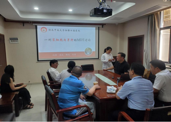 8月6日,应“口腔癌及癌前病变的诊疗团队”的申请要求,患者杨某因右下后牙区疼痛不适伴张口受限,辗转多地求医未果后来到我院。为了给予患者更为全面和精准的治疗方案,我院迅速启动了学科协作诊疗(MDT)机制,联系了院内外多个相关科室专家。8月8日上午,该团队就这一病例在门诊二栋一楼东头会议室召开了学科协作诊疗(MDT)讨论会,本次会议邀请了湘雅医院口腔颌面外科蒋灿华教授、肿瘤科伍海军教授、血液科姜志平教授以及本院颌面外科唐瞻贵教授、胡延佳教授、牙周科刘斌杰教授、病理科李龙老师以及医院多个临床科室的负责人参加。