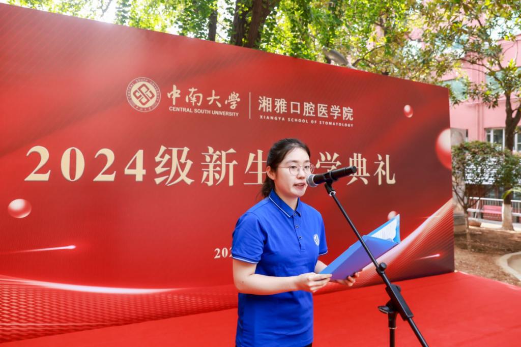 2024级本科新生代表赵婉莹就如何“把稳内心之‘舵’,让大学生活行稳致远”和大家分享了自己的目标与信念。赵婉莹认为,作为一名大学新生,应当努力做到三点,一是欣逢盛世,不负韶华,以真理为目标,以实践为道路,为口腔医学事业添砖加瓦;二是志存高远,脚踏实地,存真务实,追求卓越,为民族复兴奉献青春力量;三是热爱集体,心怀感恩,跟师长学经验,与同学多交流,回首不忘来时路。她号召大家赓续湘雅精神,勠力同心,踔厉奋发,勇敢迎接新的机遇与挑战,用青春和奋斗书写新时代的青年担当。