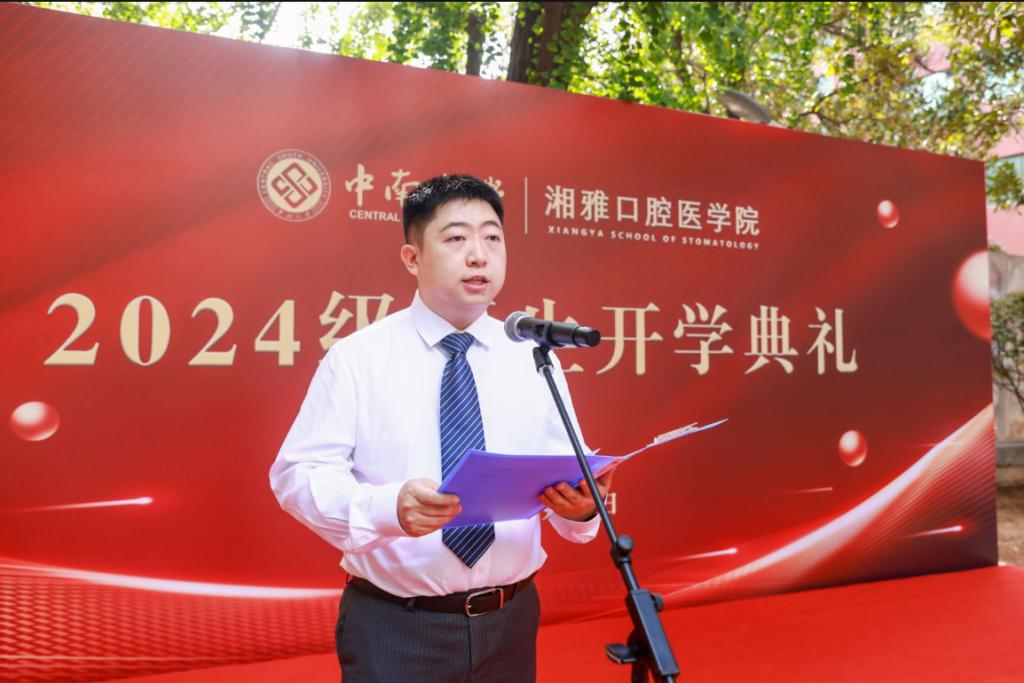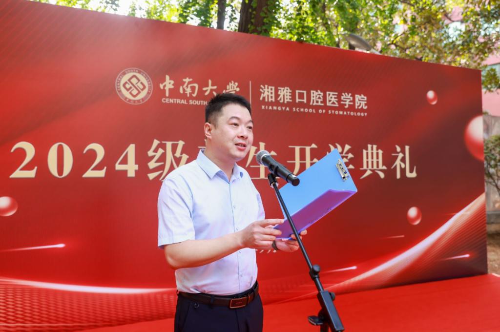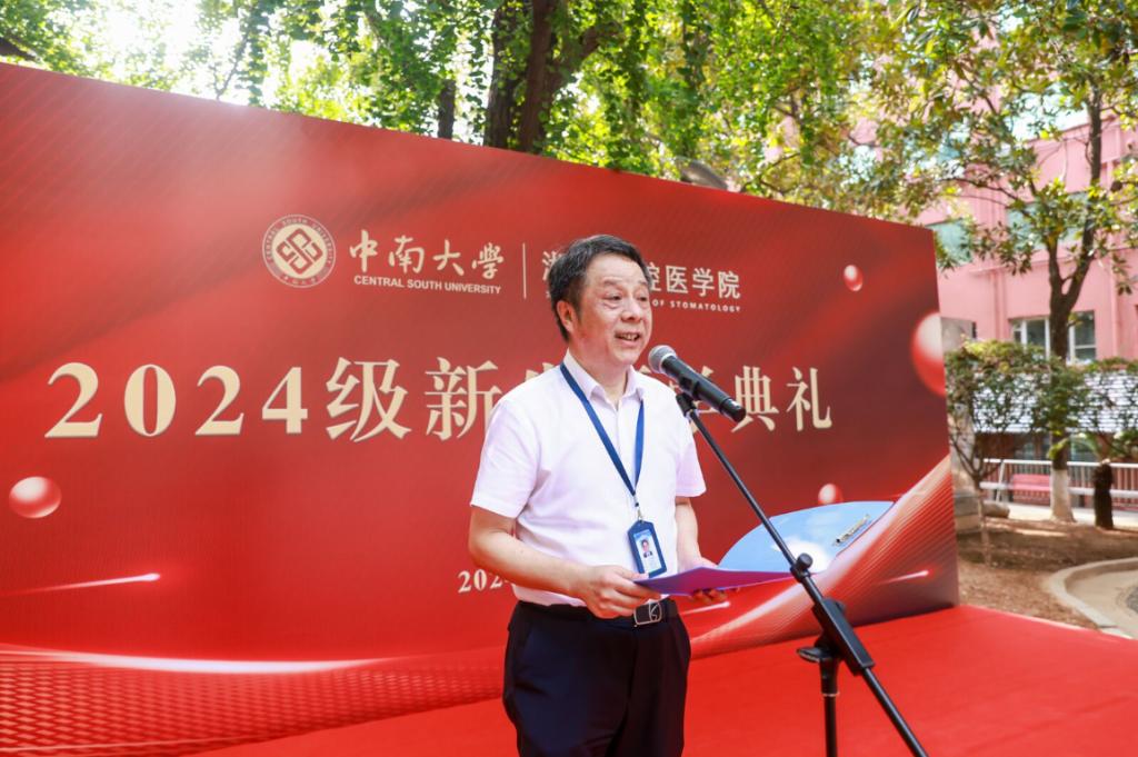 院长刘欧胜代表学院向新加入湘雅口腔大家庭的同学们表示了热烈的欢迎。他和大家一起回顾湘雅口腔的发展历史,讲述湘雅口腔人在岁月中以“公勇勤慎,诚爱谦廉;求真求确,必邃必专”的湘雅精神为旗帜、以“人民满意、特色鲜明、国内一流”的湘雅口腔医学梦为牵引,勇立潮头、奋楫当先的奋斗史,希望湘雅宝贵的精神财富成为各位新成员共同的价值追求,并向同学们表达了几点期望:一是,要坚守生命至上,牢记医者初心,有“咬定青山不放松”的毅力,作为新时代的医学人才,必须时刻牢记医者仁心的初心和大医精诚的使命,以人民健康为中心,不断追求卓越、勇攀医学高峰。二是,要弘扬求真理念,担当医学使命,有“一张蓝图绘到底”的定力,以悬壶济世的初心、求真求确的决心、脚踏实地的恒心,在求学之路上深耕厚植,笃行不怠。三是,要不断上下求索,持续提升自我,有“直挂云帆济沧海”的魄力,作为未来医学发展的中坚力量,必须具备终身学习的意识和能力,不断更新自己的知识和技能体系,也要敢于创新、勇于探索。四是,要恪守医德医风,维护行业形象,有“一片冰心在玉壶”的澄澈,坚守学医初心,坚守医学伦理和道德底线,用自己的实际行动去践行医者的职业精神和道德风范。