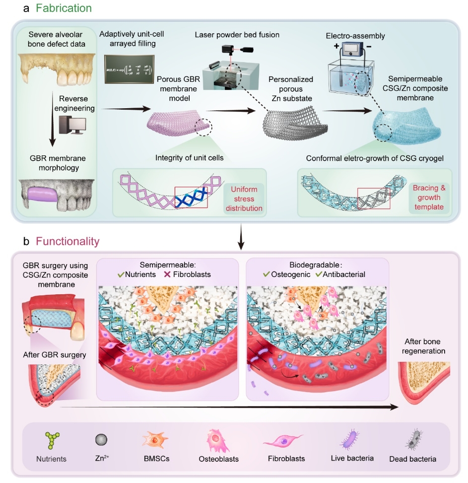为了解决以上需求,本研究探索一种基于电化学组装和激光粉末床熔融的复合增材制造方法以制备个性化、半透性和可生物降解的高分子/金属GBR膜。具体而言,首先根据患者牙槽骨缺损的CBCT数据,通过逆向工程建立个性化GBR膜所需的复杂曲面外形模型。其次,采用自主研发的“曲面随形单元填充算法”实现复杂曲面膜的多孔结构设计。相较于传统单元填充设计,该新设计方法能确保复杂曲面上单元结构的完整性和应力分布的均匀。随后,通过激光粉末床熔融技术3D打印个性化的多孔曲面锌膜基底;利用电化学组装技术,以多孔曲面锌膜作为支撑结构和模板,让壳聚糖/明胶的冷冻凝胶在锌基底表面生长,实现大孔金属膜和小孔高分子膜的“共形互嵌”,以满足GBR膜的半渗透性要求(图1a)。研究表明该复合膜能够有效传输营养物质,同时抑制100%成纤维细胞的浸润。与纯多孔锌膜相比,壳聚糖/明胶冷冻凝胶膜的共形覆盖增强了GBR膜的机械性能并降低了其降解速率,使其能保证60天以上的结构完整性,有利于GBR术后初期成骨所需要的空间维持。此外,通过控制降解速率,该复合膜缓解了纯多孔锌膜初期降解过程中Zn2+释放过快所带来的细胞毒性。通过缓释Zn2+,该复合膜还能表现出显著的促成骨和抗感染能力(图1b)。这些发现提示该个性化、半渗透、可降解锌/壳聚糖-明胶膜在大面积或复杂牙槽骨缺损GBR术中的应用潜力,并为如何利用电化学组装-激光粉末床熔化复合增材方法构建个性化高分子/金属复合生物材料提供了应用参考。