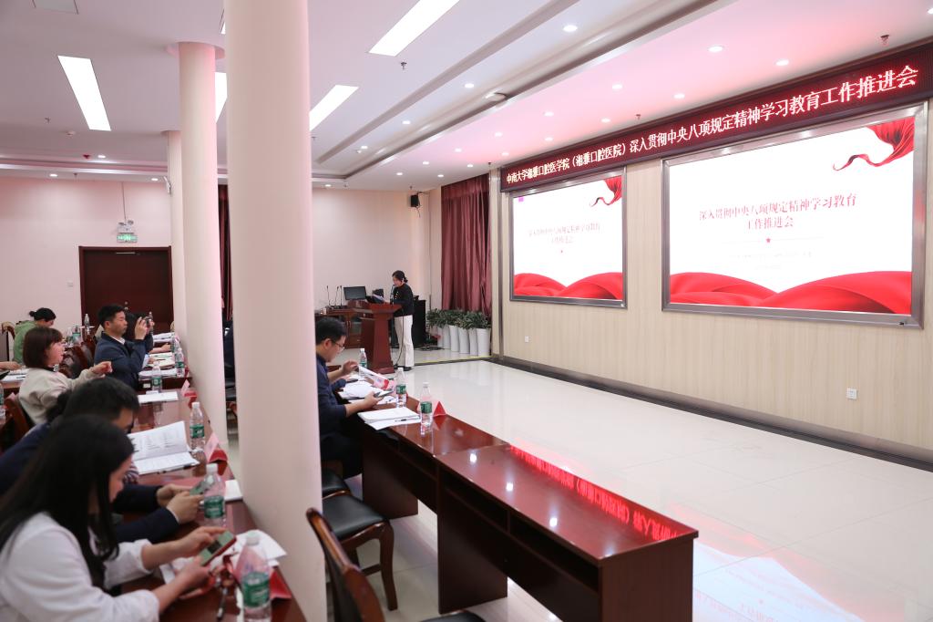 会议传达学习习近平总书记关于深入贯彻中央八项规定精神学习教育的重要讲话、重要指示精神及有关会议、文件精神。院党委副书记、纪委书记、工作专班副组长涂杜思介绍了《中共yl6809永利湘雅口腔医学院(湘雅口腔医院)委员会关于在全院开展深入贯彻中央八项规定精神学习教育的实施方案》暨工作部署。