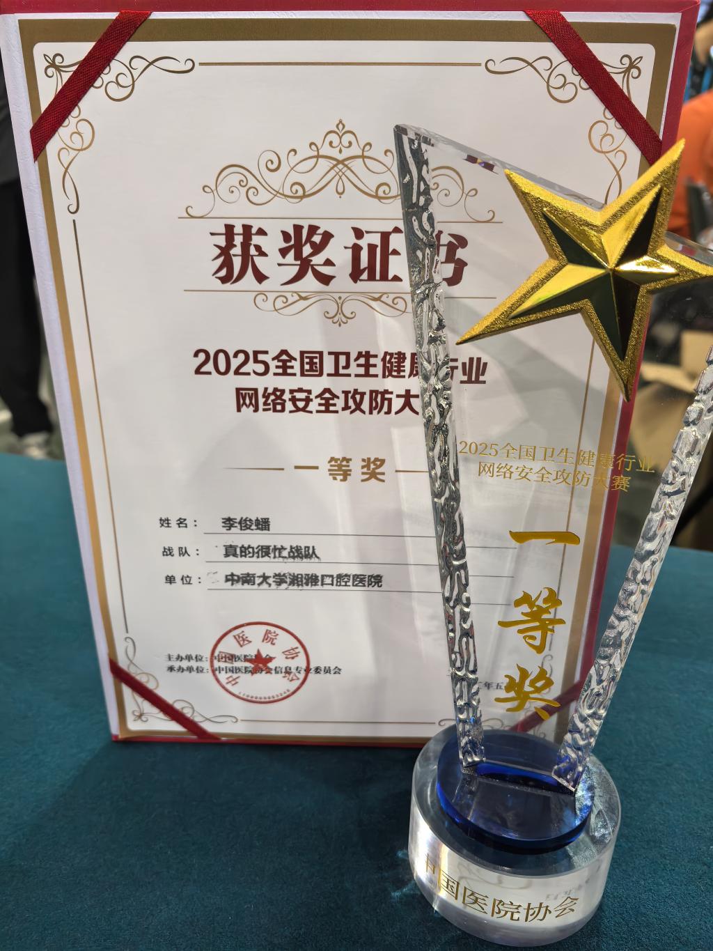 5月10日,由中国医院协会主办的“2025全国卫生健康行业网络安全攻防大赛”在厦门举行。我院信息中心李俊蟠等组成团队在比赛中表现出色,凭借扎实的技术功底、高效的团队协作和出色的临场应变能力,获得大赛一等奖。