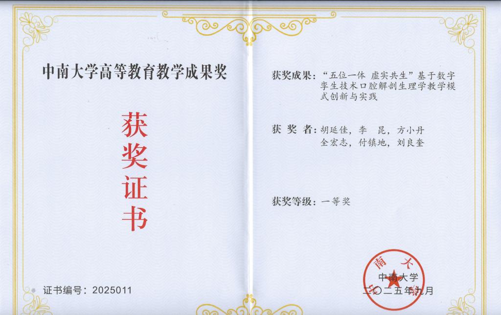 11月14日,yl6809永利公布教学成果奖评选结果,由我院口腔解剖生理学教研室胡延佳教授团队申报的《“五位一体、虚实共生”口腔解剖生理学教学模式创新与实践》项目荣获一等奖。该项目在数字化教学改革方面取得重要突破,为口腔医学人才培养提供了新范式。