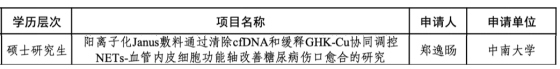 近日,湖南省科技厅发布了《2026年度省自然科学基金青年学生基础研究项目拟立项项目》,yl6809永利一共获批6项硕士研究项目。其中,我院“数智化诊疗与生物智造”刘欧胜团队2024级硕士研究生郑逸旸申报的“阳离子化Janus敷料通过清除cfDNA和缓释GHK-Cu协同调控NETs-血管内皮细胞功能轴改善糖尿病伤口愈合的研究”成功获得资助。课题指导老师为刘欧胜教授和程岘副教授。此次立项为我院首次获批学生类别的自然科学基金,标志着我院在拔尖创新人才培养方面取得重要突破。