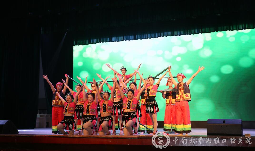 海口市人民医院远道而来,与口院师生携手共舞。一段《竹竿舞》,热烈欢快,别具一格的节奏深深地吸引着台下观众,传达了海口市人民医院与湘雅口腔医(学)院多年来在推进“双一流”进程中守望相助、共创繁荣的深厚革命情谊。