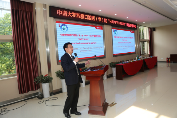 活动由科研部主任王月红主持,唐瞻贵院长、李奉华副院长、沈子华教授、陈晓婧教授以及学校国际交流处的老师们出席了活动。唐瞻贵院长在致辞中指出搭建“Happy hour”国际交流平台旨在建立国际化校园人文环境,促进多种文化的相互学习,提升我院师生的国际化视野。同时,他希望通过该平台将“百年湘雅”的精神在中外学生中发扬光大。