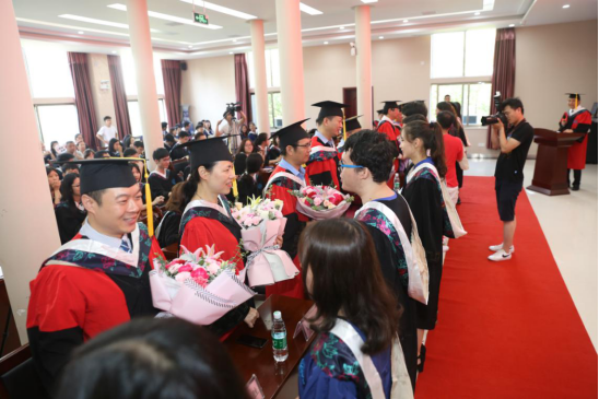 最后,毕业生们身着学位服依次走上主席台接受“拨穗礼”,唐院长为全体毕业生授予学位、扶正流苏,并合影留念。