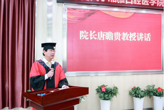 院长唐瞻贵教授代表学院祝贺毕业生顺利完成学业,感谢老师和父母家人对同学们辛苦学业的无私支持与付出。他希望大家在新的征程中沿着新的人生轨道,热情奔跑、一路向前。唐院长勉励毕业生们:一是做一个有思想,有情怀的人。大学的价值最重要的是对于人的精神塑造,前行路上,带着中南精神和湘雅精神,能让大家笑对风雨、收获精彩人生。二是在别人看不见的地方默默扎根。应该做一个像毛竹这样的人,默默努力,默默积累。只有在强韧的耐心和勤恳的耕耘,默默扎根以后,有朝一日才可茂密成林。三是遇到困难时学会转弯。人生处世如行路,常有山水阻身前。学会转弯,不是选择放弃,而是选对方向;学会转弯,不是懦弱无能,而是认清自己。唐院长希望同学们将个人梦、医学梦与中国梦结合起来,做一个有梦想、有情怀的人,投身健康中国战略和学校“双一流”建设,坚持最初的理想,坚持对专业的热爱,坚持对医学的崇敬,在科研和从医的道路上打牢基础知识,锻炼独立思考能力,培养严谨求实的精神和医者仁心的品德。