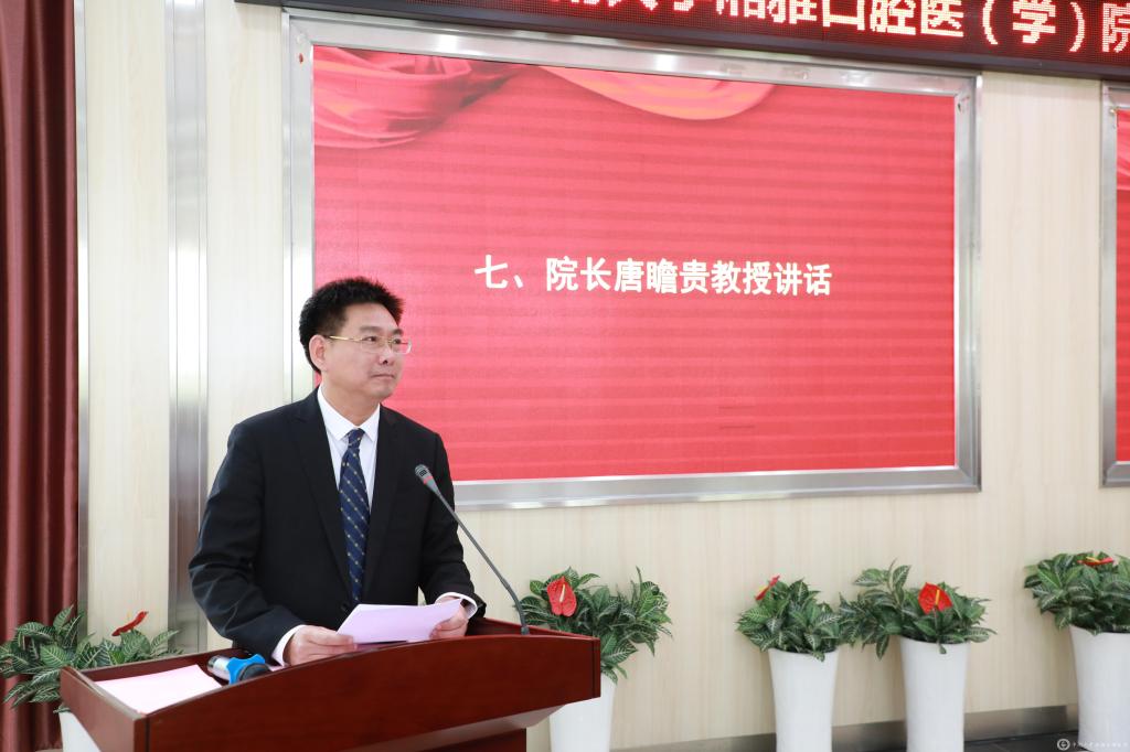 唐瞻贵院长以《不忘初心,逐梦前行》为题,在即将开启新阶段的美好时刻,对新生们提出了三点建议:第一,立下小目标。要逐步明确自己的方向,关心国家、关心社会,关心自己,关心未来,培养医学生特有的家国情怀。第二,怀揣爱与责任。爱与责任是医者的灵魂,选择了医学,就选择了担当;选择了湘雅口腔,就要开始慢慢学会为病人的口腔健康保驾护航。第三,敢于去承受。人生的路不可能一帆风顺,成长为一名口腔医生更是充满了很多挑战。在逐梦的道路上,必然要经历困难与挫折的洗礼,即使跌倒了,也要坚强的爬起来。他最后说“希望大家传承好一代代湘雅人的优良传统,立报国之志、学报国之才、践报国之行,以昂扬奋发的精神面貌迎接新中国成立70周年。”