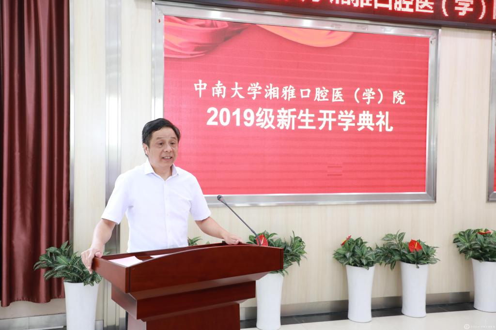 开学典礼由院党委书记邓超纲主持。会上,新老生代表、教师代表在发言中表达了对大学生活的美好祝福与期待,寄语新生成长成才、不负韶华。唐瞻贵院长发表了热情洋溢的讲话,欢迎2019级新生加入湘雅口腔医(学)院这个大家庭。全体2019级新生聆听师长谆谆教诲,开启人生新的旅程。