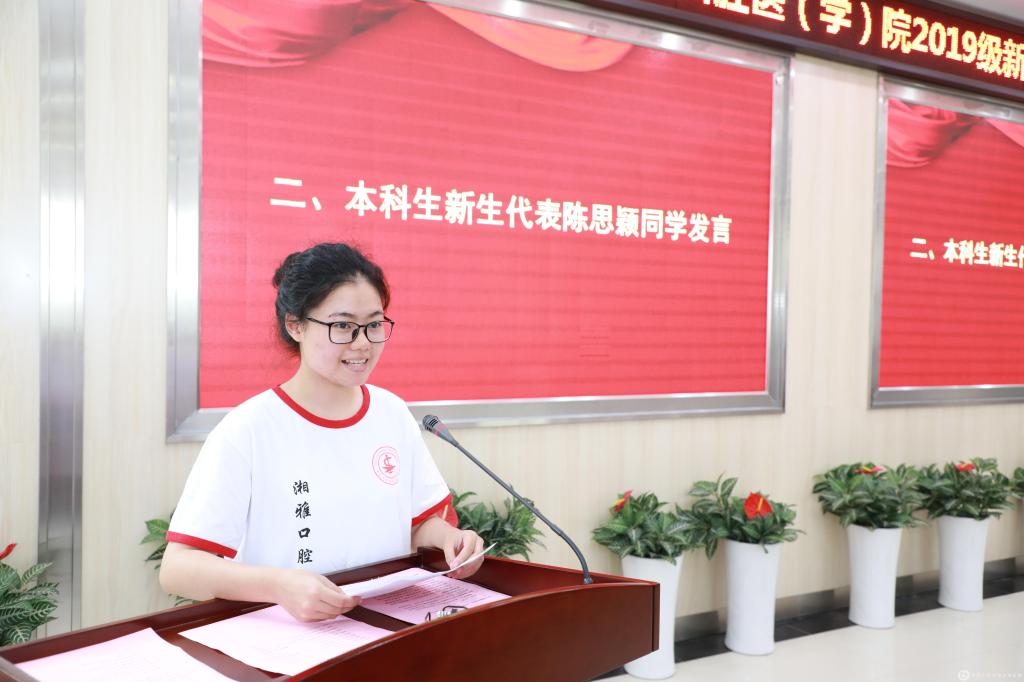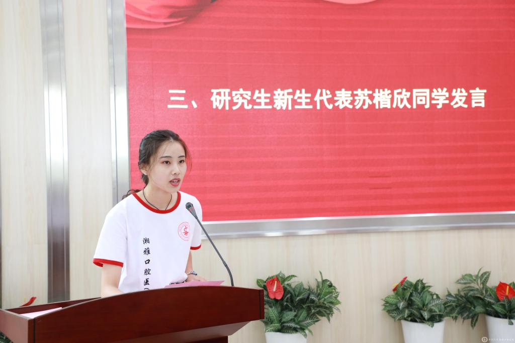 2019级本科生陈思颖同学讲述了自己高考后,在从事医学事业的父母影响下,毅然选择从福建到湖南,来湘雅学习口腔医学的心路历程,她希望在学习医学的道路上一路前行、一路思考,探寻人生意义与价值。2019级研究生苏楷欣同学在发言中表达了自己对步入新阶段的思考,她号召同学们在学习和科研的道路上要有锲而不舍的耐心、开拓视野的信心、承担责任的决心,向着理想的方向更好地前进。老生代表、学生会主席刘博阳同学结合自己三年的大学生活,从专业学习、学科竞赛、学生工作等方面向新同学们给出了诸多成长建议,希望新同学们把握今天、展望明天,攀爬一座又一座高山险峰,为湘雅口腔医学事业的发展贡献自己的一份力量。
