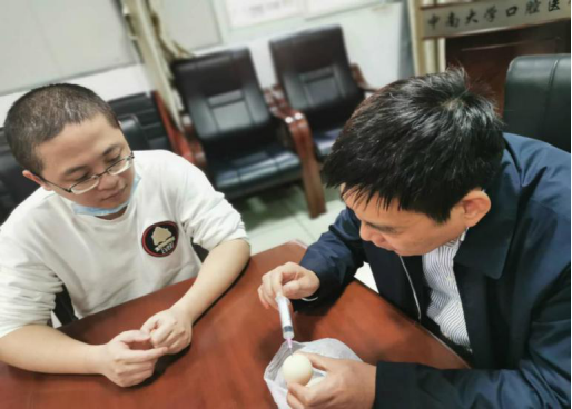 医学教学中诊断是基础。为保证学生对于知识理解的客观性,口腔颌面外科唐瞻贵教授在录播教学PPT之后,专门利用注射器和鸡蛋作为实物教具,模拟术中操作,讲解诊断区别。
