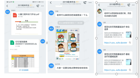 众所周知,临床实习是口腔医学教育的重要组成部分,是口腔医学教学计划的最后阶段。通过临床实践,学生可以获得基本知识、基本理论、基本技能的综合训练。受疫情影响,实践教学遇到了前所未有的困难。为缓解医学生实习压力,学院教务部要求各科室梳理实习教学内容,将其分解为线上教学和线下教学两个部分,运用网络手段(钉钉直播)于3月16日起开展线上实习教学。为实现模拟实习轮转,教务部门试行各大直播软件,最终选用钉钉作为直播软件,基于钉钉建立班级群,发出线上实习公告。科室老师将实习内容分解,梳理出线上教学内容。按课表安排在群内进行线上授课(科室实习讲座)、辅导答疑及布置作业。截至目前,学院线上实习已完成一周教学。