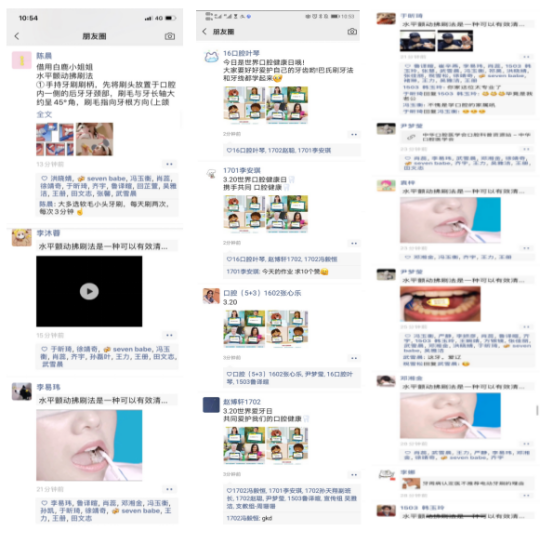 健康宣传海报,鼓励学生们以海报,视频等方式在互联网上宣传正确刷牙法,布置了朋友圈健康宣教10赞打卡的作业,同学们热情高涨,课程结束后大家的朋友圈迅速霸屏,起到了良好的效果。