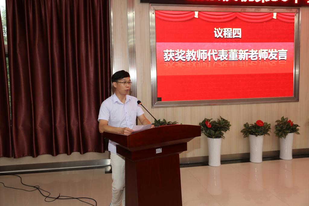 获奖教师代表董新在发言中分享了自己从事教学工作8年来的所思所感,表示会将教学作为自己热爱的事业坚持下去,全面落实立德树人根本任务,做好学生成长成才的引路人。