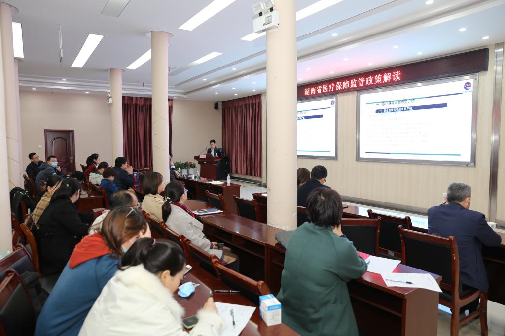 3月23日,湖南省医保局医疗生育保险服务中心副主任刘敬伟、稽核部部长肖航应邀来院讲解医保政策。讲座由谢晓莉副院长主持,全院教职员工参加培训。
