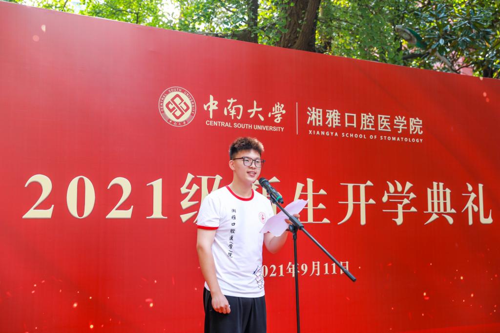 本科生新生代表蒋嘉灿同学在发言中表达了“步入中南,拾慧湘雅”的心潮澎湃。他表示,为医学事业奉献青春是神圣而伟大的选择,是践行人生理想的新征程。同时他做出承诺,不负党和国家的期望,心怀人民的健康幸福,继承湘雅的优良传统,怀着饱满的激情投入到未来的学习和工作之中。