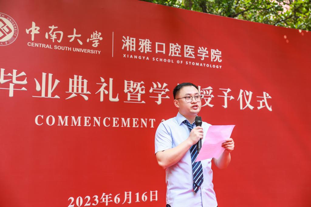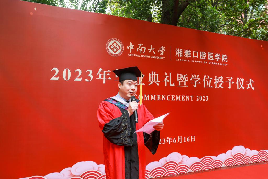 牙体牙髓科许来俊代表学院全体教师,向每一位今天主角们送上“毕业快乐”的祝福。“今天,让我们放下手中忙碌的学习和工作,欢聚一堂对过去的日子说声“再见”,相互诉说过去这三年、五年甚至是八年在学校的最美好的时光。明天,我们即将提起行囊,带着湘雅人的骄傲和自豪出发,去奔赴我们美好的前程。”他希望同学们怀着感恩的心好好告别,拥抱明天。