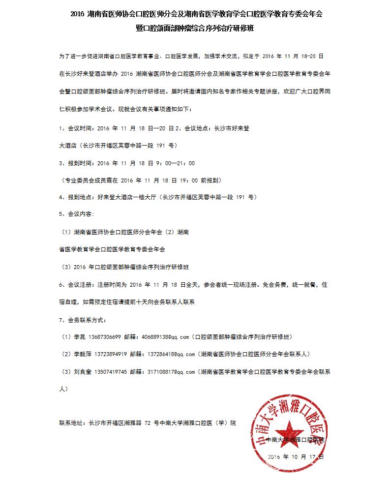 为了进一步促进湖南省口腔医学教育事业、口腔医学发展,加强学术交流,拟定于2016 年 11 月 18-20 日在长沙好来登酒店举办2016 湖南省医师协会口腔医师分会及湖南省医学教育学会口腔医学教育专委会年会暨口腔颌面部肿瘤综合序列治疗研修班。届时将邀请国内知名专家作相关专题讲座,欢迎广大口腔界同仁积极参加学术会议。现就会议有关事项通知如下: