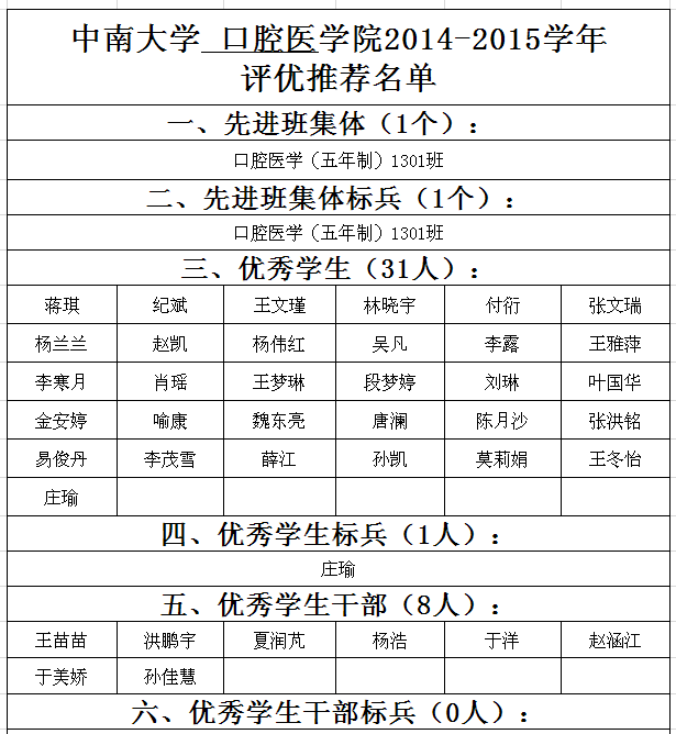 口腔医学院2014—2015学年评优推荐名单