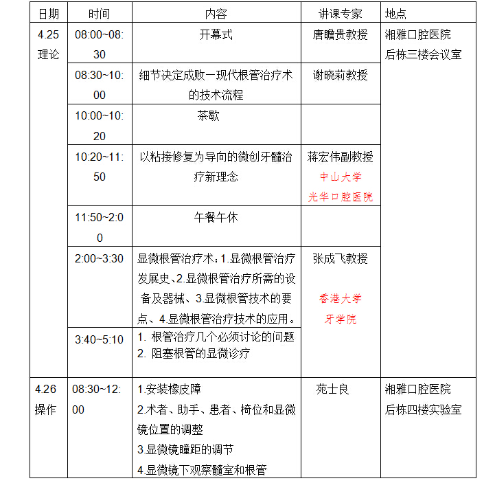 为了介绍、推广和普及根管治疗技术,提高牙髓病治疗水平,yl6809永利湘雅口腔医院定于2015年4月25~26日举办国家级继续教育项目《显微根管治疗和牙体牙髓一体化治疗新技术培训班》研修班,同时特邀来自香港大学、中山大学等专家教授进行授课。学习班理论授课内容包括显微牙髓治疗和再治疗技术、显微根尖手术临床新进展、牙髓根尖周疑难病例治疗的临床新进展等;操作培训内容包括显微镜下镍钛器械根管预备和充填、分离器械的处理术等。