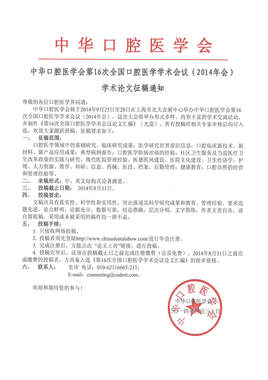 中华口腔医学会第16次全国口腔医学学术会议(2014年会)学术论文征稿通知