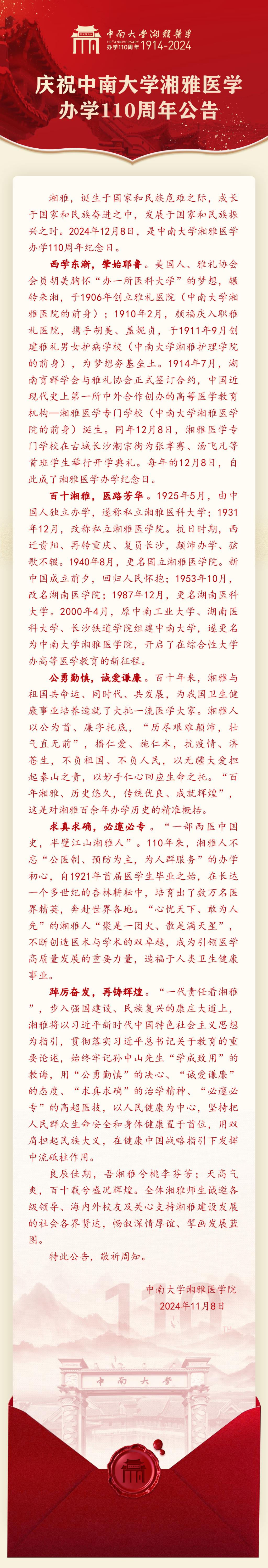 【湘雅医学办学110周年】庆祝yl6809永利湘雅医学办学110周年公告