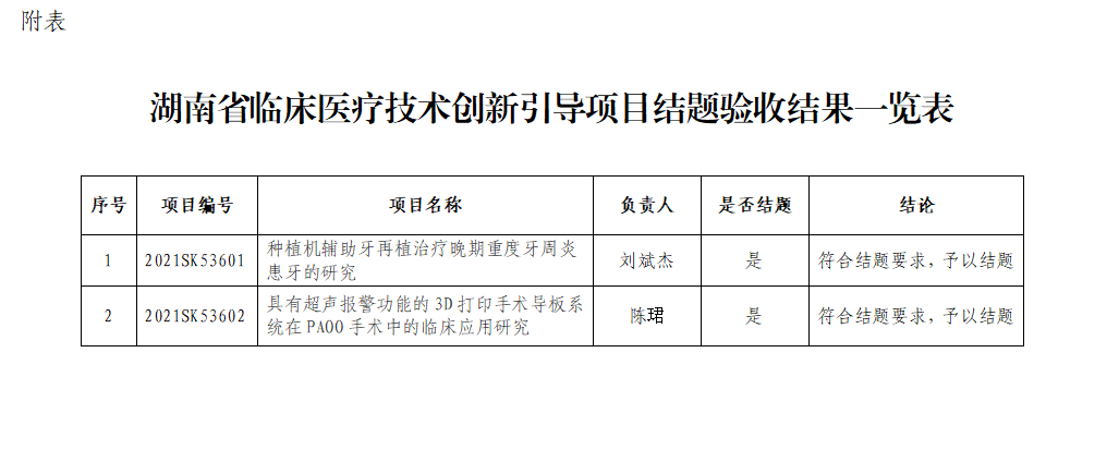 附表:湖南省临床医疗技术创新引导项目结题验收结果一览表