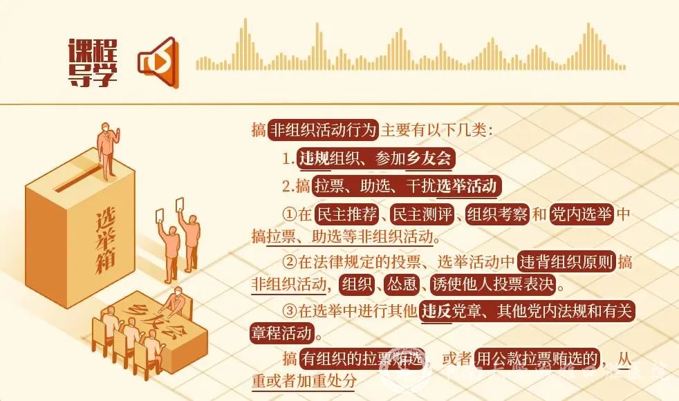 《中国共产党纪律处分条例》第八十二条、第八十三条对搞非组织活动行为列出负面清单,对违规组织、参加乡友会,以及搞拉票、助选、干扰选举活动作出处分规定。